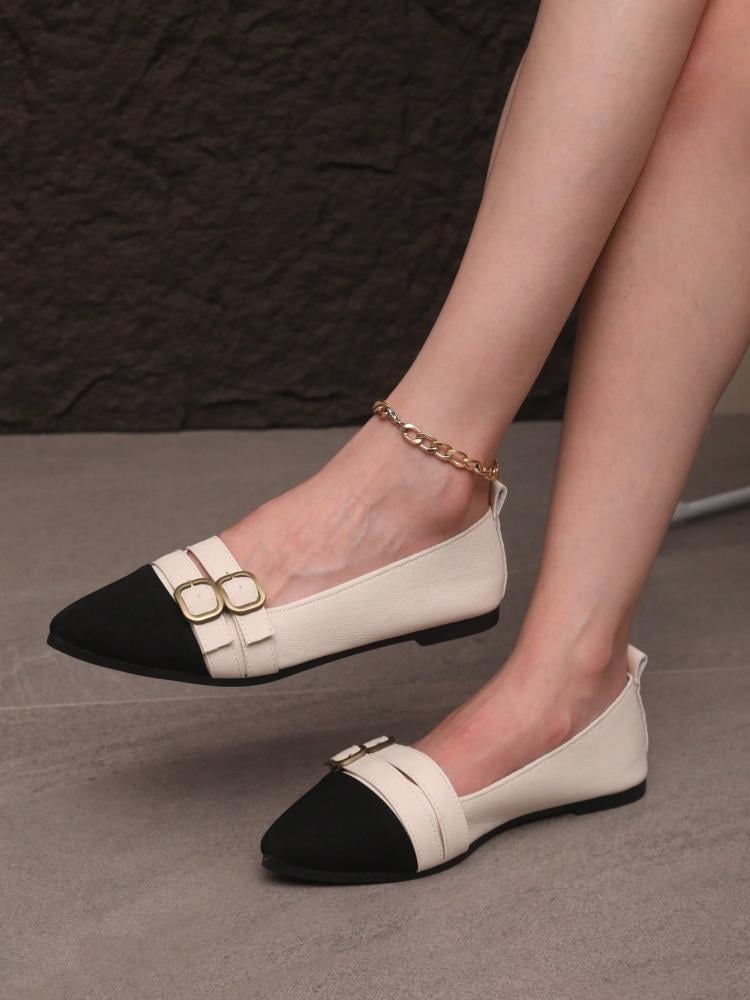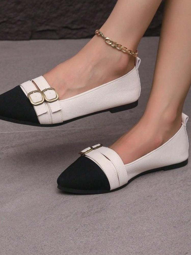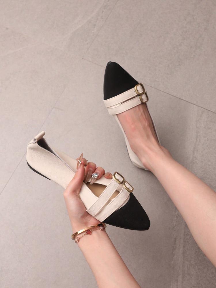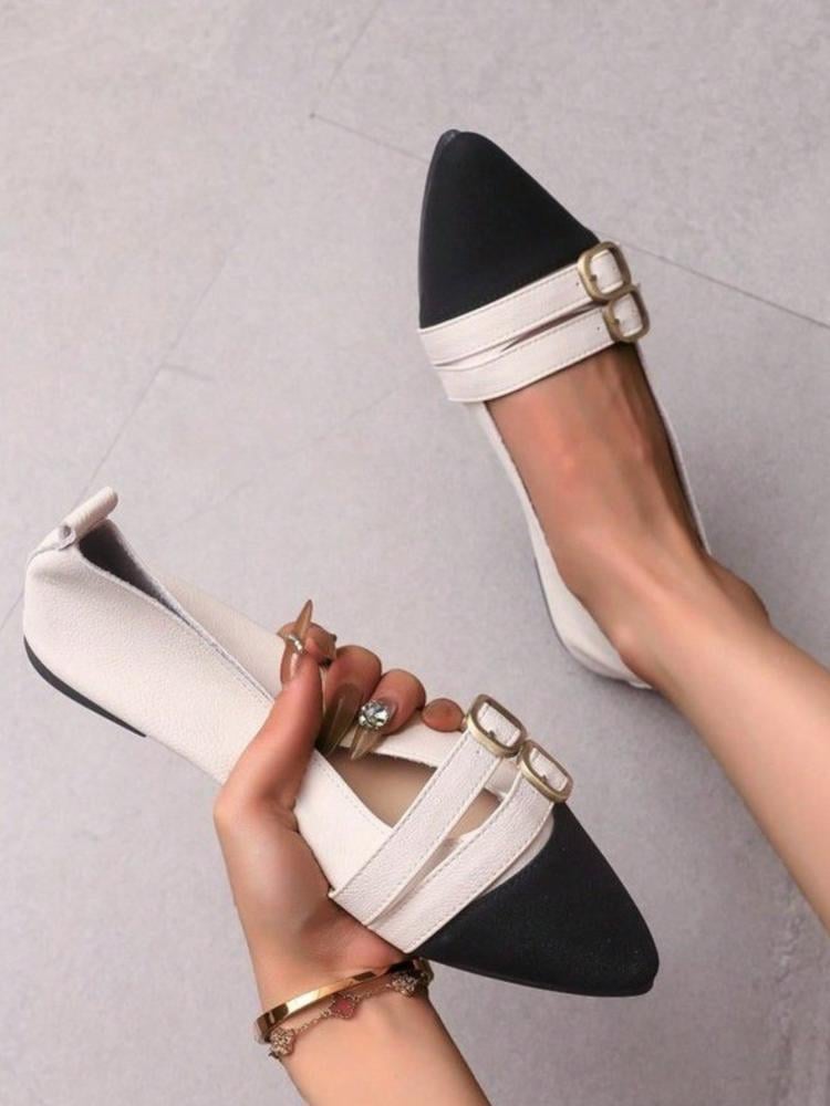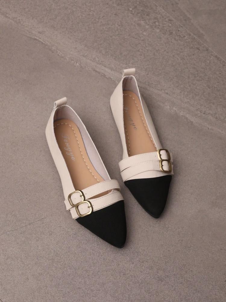 احذية مريحة نسائية مسطحة براس مدبب بتصميم عصري وأنيق، تجمع بين الألوان الأسود والأبيض مع تفاصيل حزام مزدوج. مثالية لإطلالة أنثوية مريحة وعصرية في كل مناسبة.